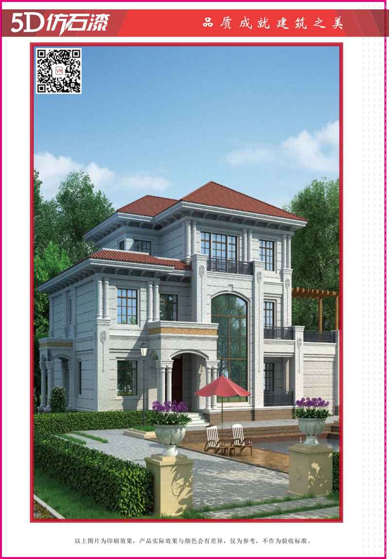 5D仿石漆采用有机硅树脂,水性聚氨脂树脂,通过制成造粒的厚浆的水性液体基料,将其放入水性保护胶体中剪切成小型水性液态色粒,然后将多种颜色的水性液态色粒混合而产生的仿花岗岩效果涂料。具有无毒无味,低VOC,轻量安全、耐候、耐污、耐擦洗、耐酸、耐碱、提供弹性抗裂及全天候性装饰及保养。轻量安全,为高档建筑外墙石材,瓷砖以外提供更环保、更高效益的建筑设计方案堪称高档建筑外墙装饰的最佳选择。